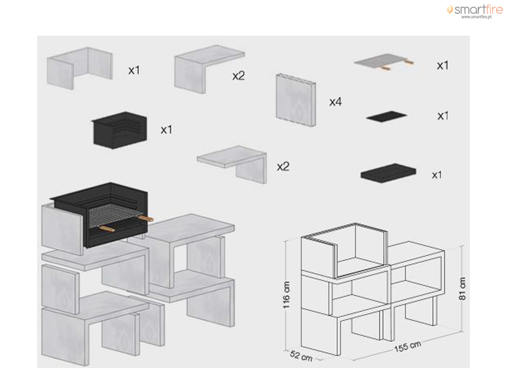 Churrasqueira composta por elementos modulares, o que permite uma fácil montagem.
