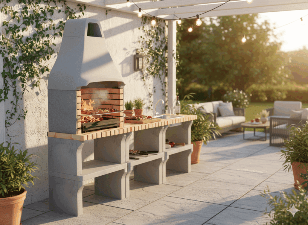 A Churrasqueira MOVELAR New Iberia XL é feita de betão cinzento e tijolo matizado, esta nova linha é um bom compromisso entre o tradicional e o moderno.