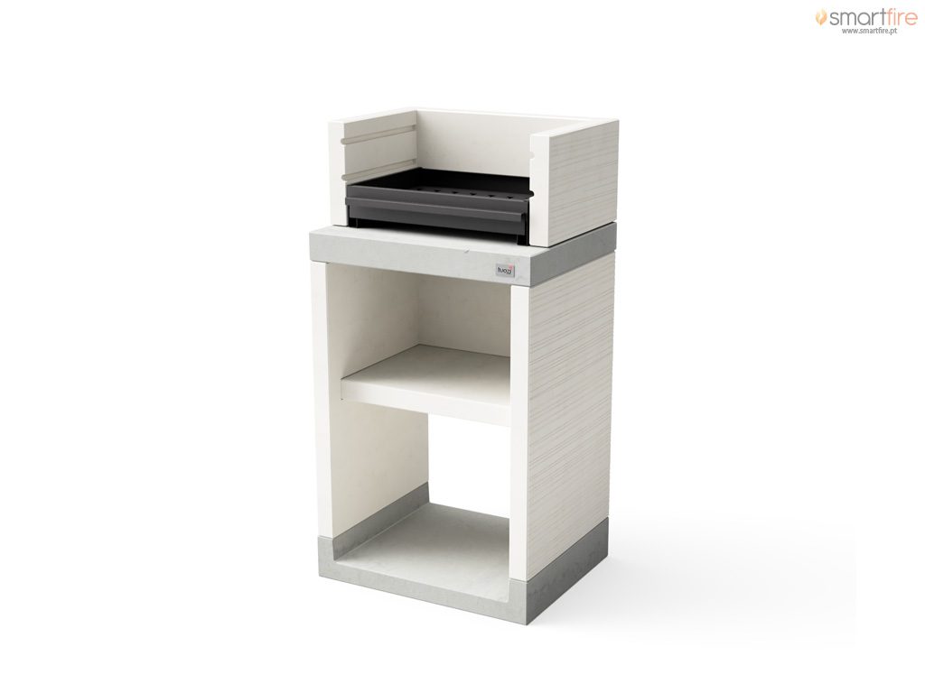 A Churrasqueira TUOZI Plan 0 Carvão é feita de betão branco e cinza com placa lateral texturada. A TUOZI Plan 0 Carvão inclui uma grelha metálica e braseiro. A TUOZI Plan 0 Carvão possui ainda uma prateleira inferior em betão branco e um rodapé antracite.
