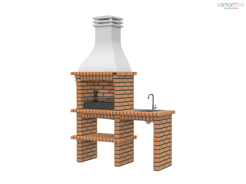 A gama Tavira tem Chaminé em branco liso; zona de fogo em tijolo e cimento refractário. Com chaminé, para melhor extracção de fumos, a Collippo Tavira possui ainda uma prateleira inferior em tijolo para arrumação de utensílios e/ carvão e lenha. Inclui uma mini-bancada lateral c/ lava-loiça que é uma óptima área de trabalho. Opcionalmente, a churrasqueira Collippo Tavira pode incluir uma grelha simples ou um grelhador de pousar com grelha e gaveta para recolha de cinzas.