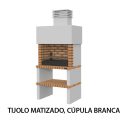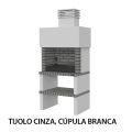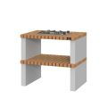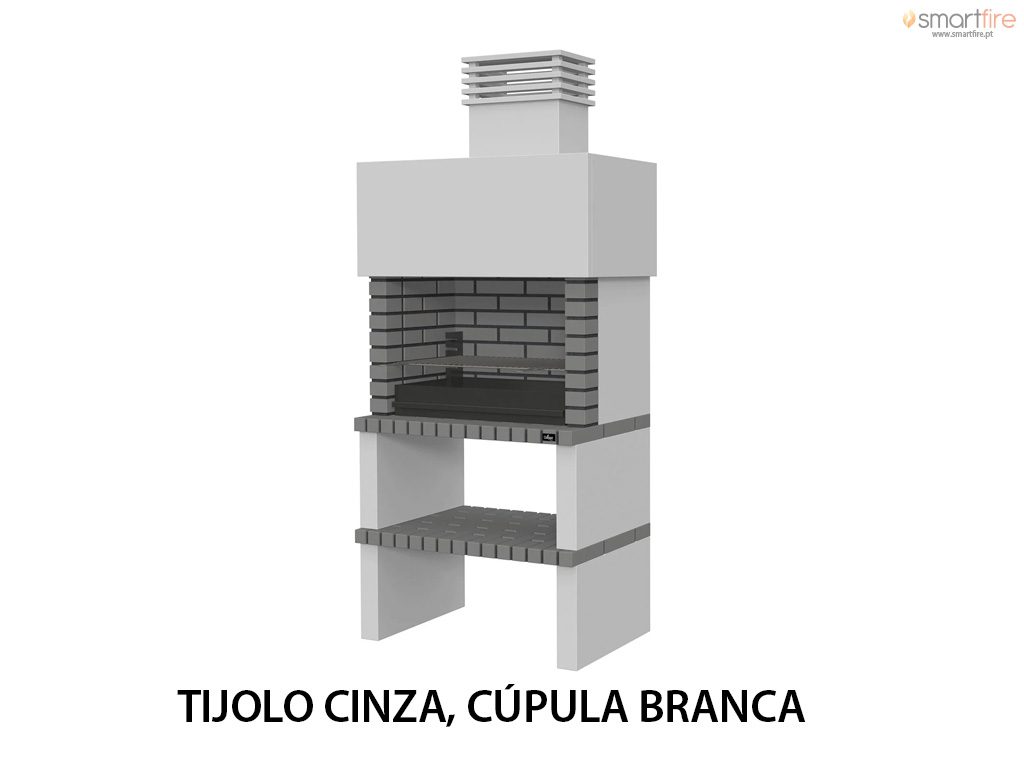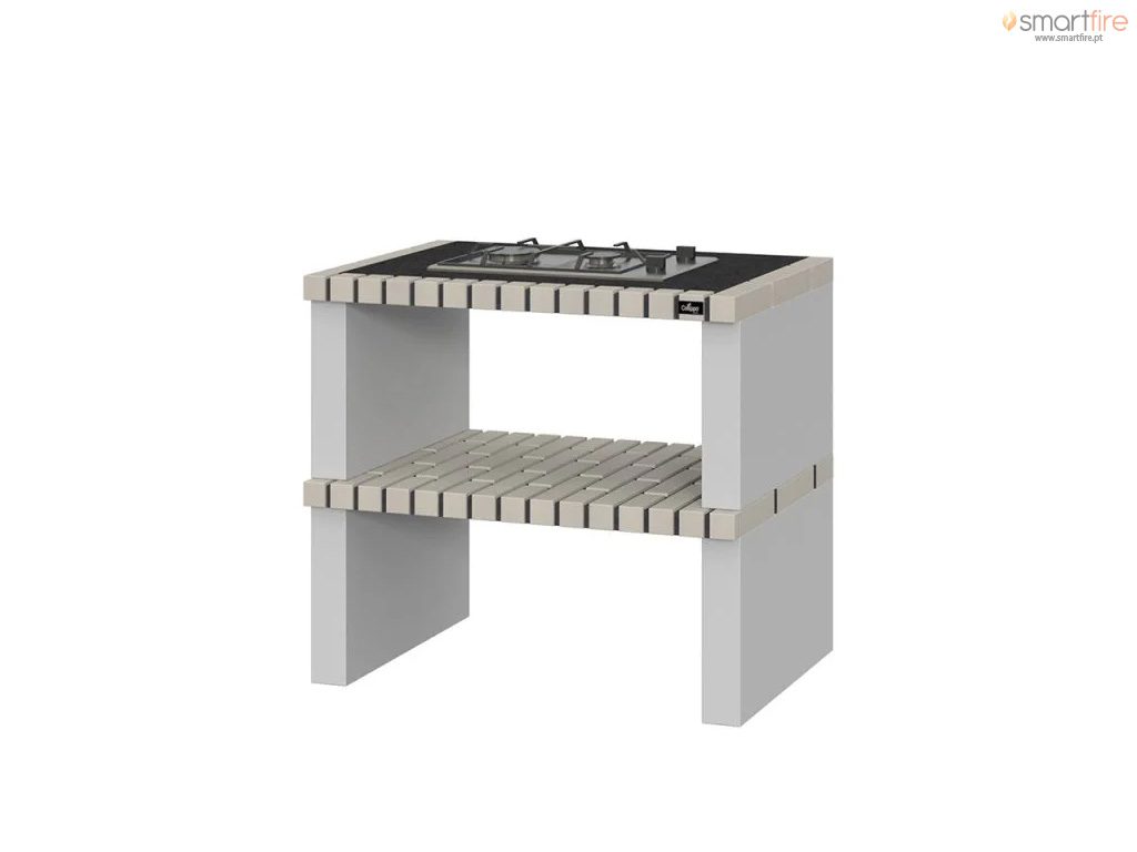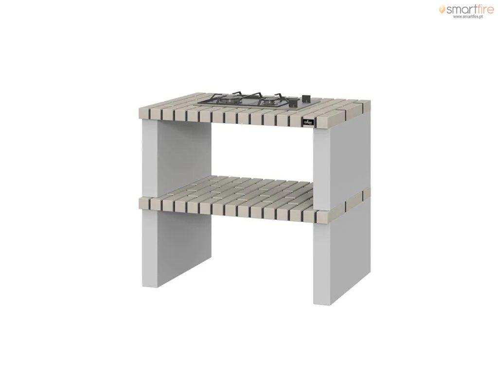 Pode optar por um grelhador de pousar (lacado) ou em inox, com vários níveis de grelha, braseiro e gaveta para recolha de cinzas. Churrasqueira em branco (laterais do braseiro em betão cinzento). Também pode adquirir bancadas simples ou com lava-loiça.