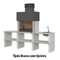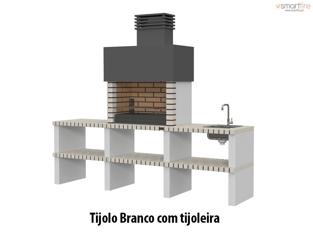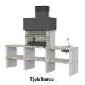 Pode optar por um grelhador de pousar (lacado) ou em inox, com vários níveis de grelha, braseiro e gaveta para recolha de cinzas. Churrasqueira em branco (laterais do braseiro em betão cinzento).