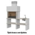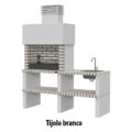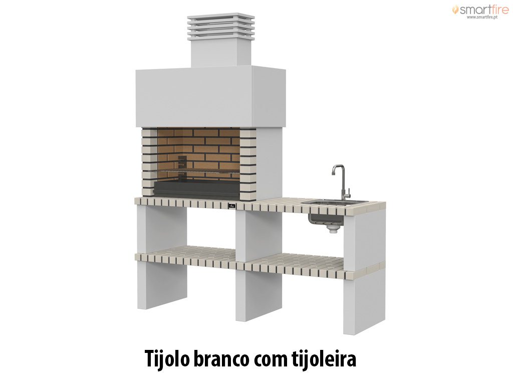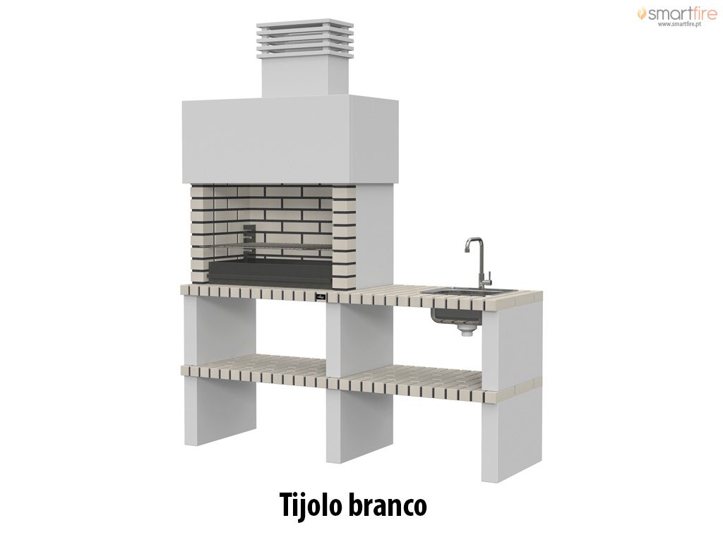 Pode optar por um grelhador de pousar (lacado) ou em inox, com vários níveis de grelha, braseiro e gaveta para recolha de cinzas. Churrasqueira em branco (laterais do braseiro em betão cinzento).
