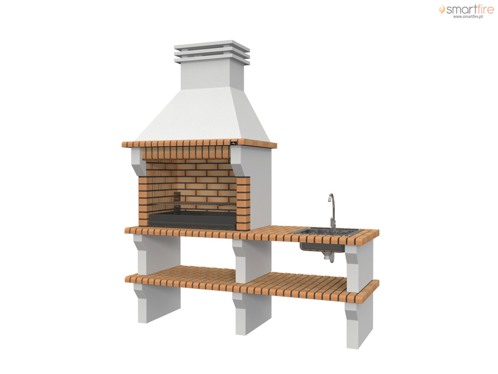 A churrasqueira é vendida em betão cinza, mas o cliente pode optar por pintá-la. Inclui Lava-Loiça e Torneira. Grelha apenas para usar carvão como combustível | Grelhador para carvão/lenha