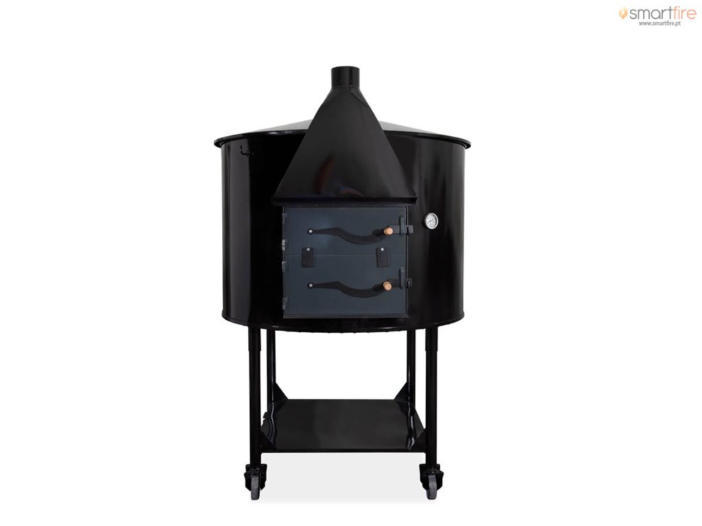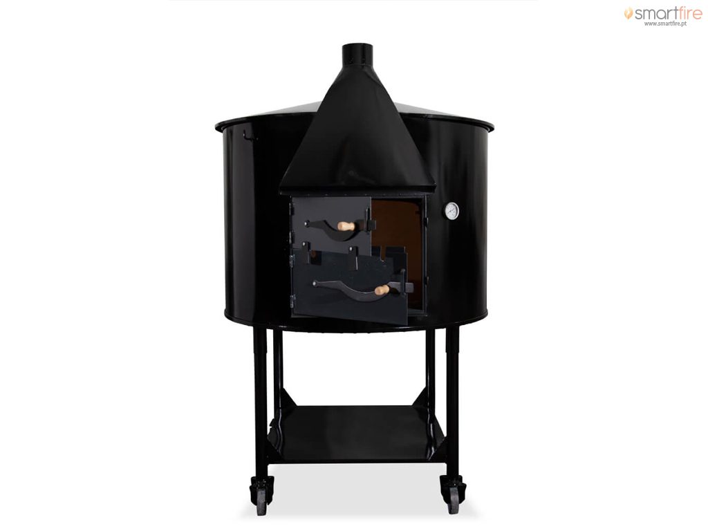 Este forno a lenha destaca-se por ser um forno em bidão simples em chapa. É um forno móvel em estrutura metálica. A chaminé é externa e o interior é em barro refractário.