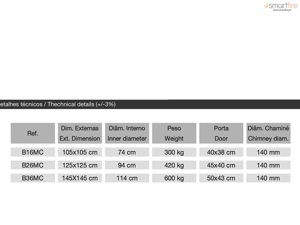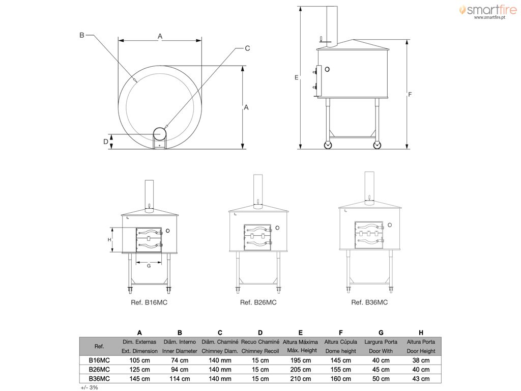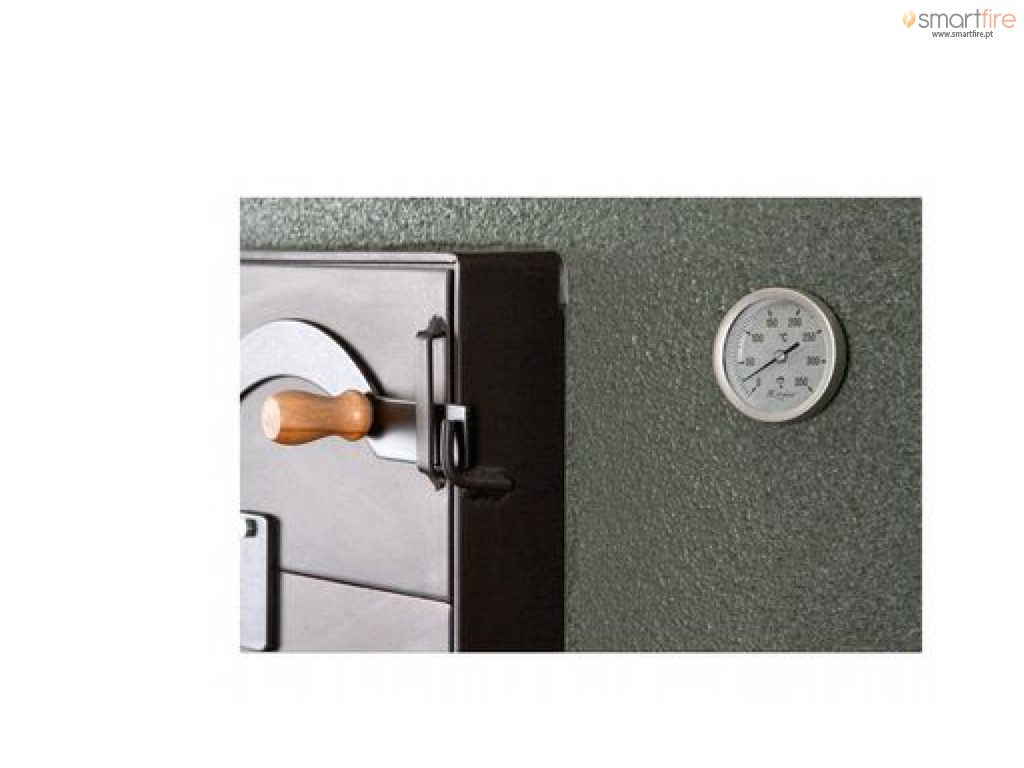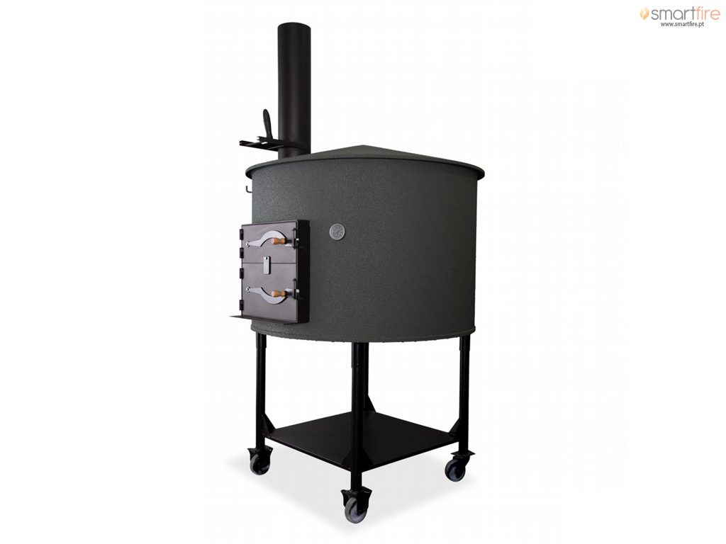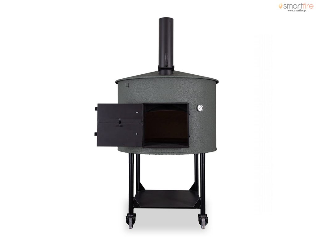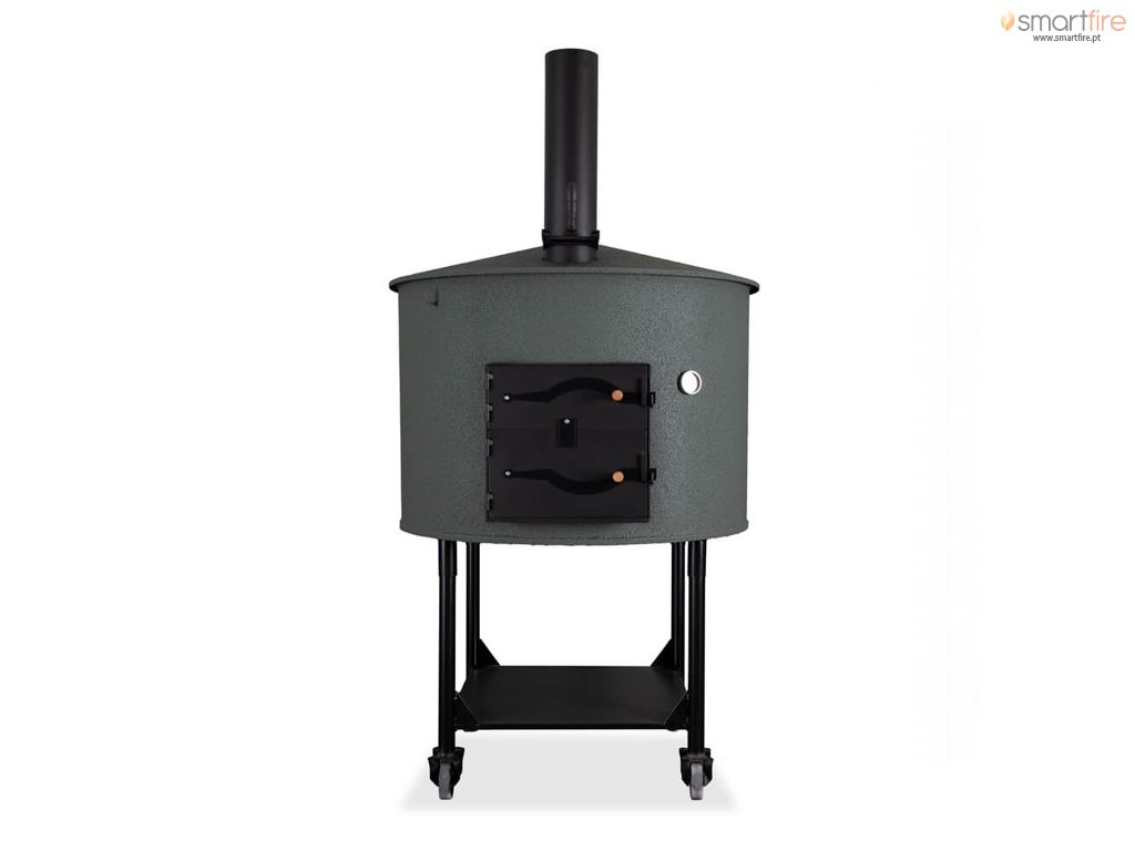 Este forno a lenha destaca-se por ser um forno em bidão com isolamento. É um forno móvel em estrutura metálica e acabamento em cortiça projectada. A chaminé interna tem controlo de fluxo e o interior é em barro refractário.