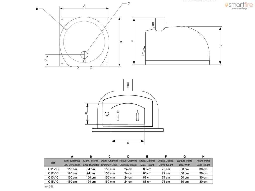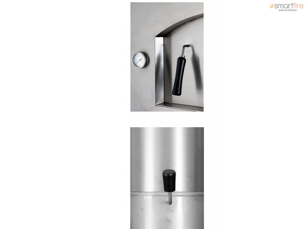 Tamanhos desde 110 cm até 150 cm de largura exterior da base. Acabamento em cortiça projectada. Interior em barro refratário com reforço estrutural. Inclui termómetro bi-metálico em aço inox. Inclui chapéu em aço inox incluído.