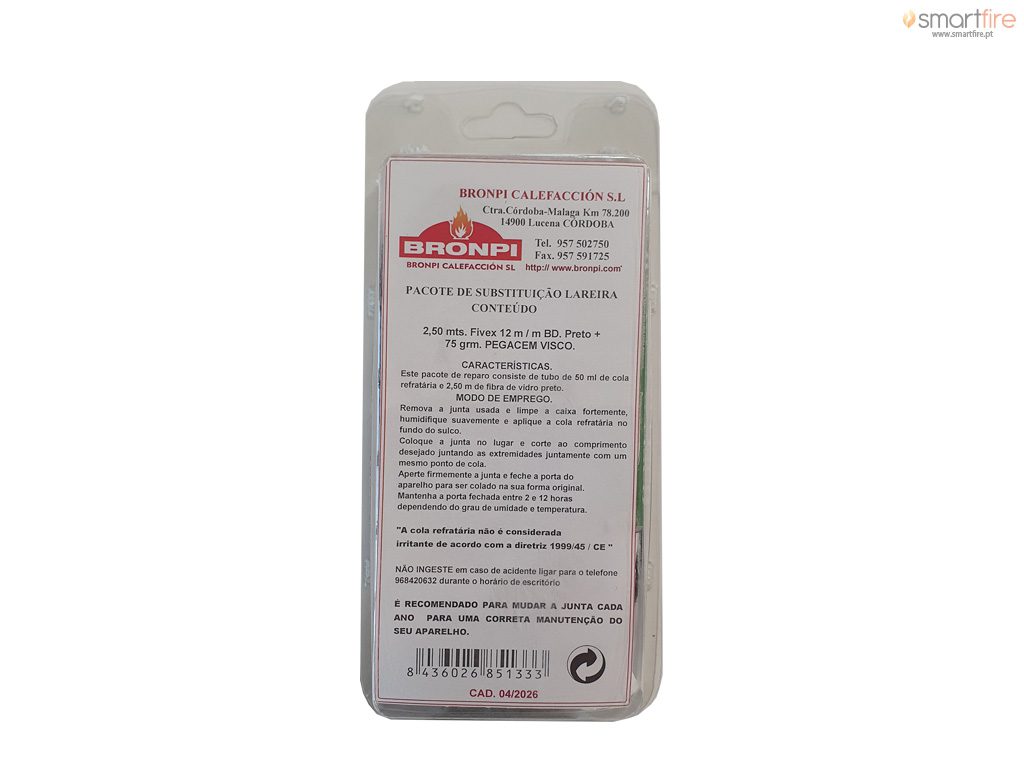 Este kit é ideal para restaurar a vedação do vidro em portas de salamandras, recuperadores de calor e caldeiras. Inclui 2,5 metros de cordão cerâmico tricotado de 12 mm (cor preta) e silicone refratário, garantindo selagem térmica eficaz e duradoura.