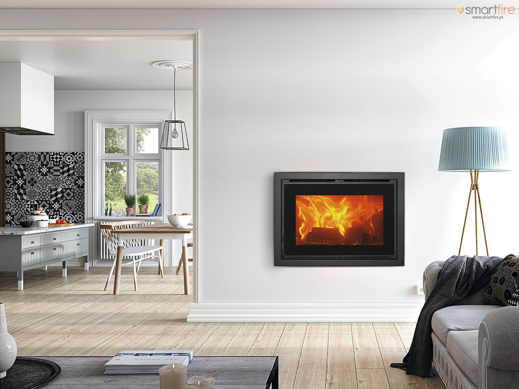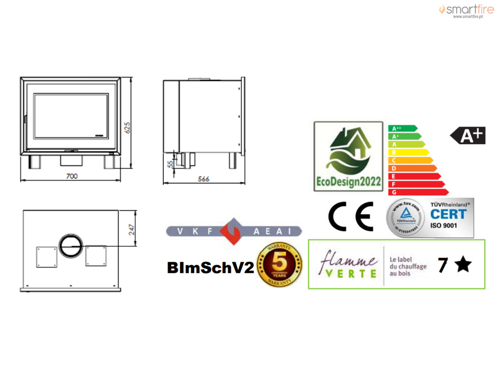 Recuperador a lenha (com ventilação) num estilo moderno e conforme as normas de Ecodesign. O seu design é ideal para todos os tipos de salas (625x700x566 mm). Tem um volume de aquecimento de 210 m3 e uma potência térmica de 7 KW. Capacidade para lenha até 50 cm, o que acrescenta funcionalidade. Porta de vidro com serigrafia e grelha de ferro fundido. Sistema de vidro limpo e vista panorâmica, permitindo uma visão máxima do incêndio. Firebox revestida a vermiculite, o que acrescenta maior potência. Tem uma entrada de ar externo e tripla combustão.