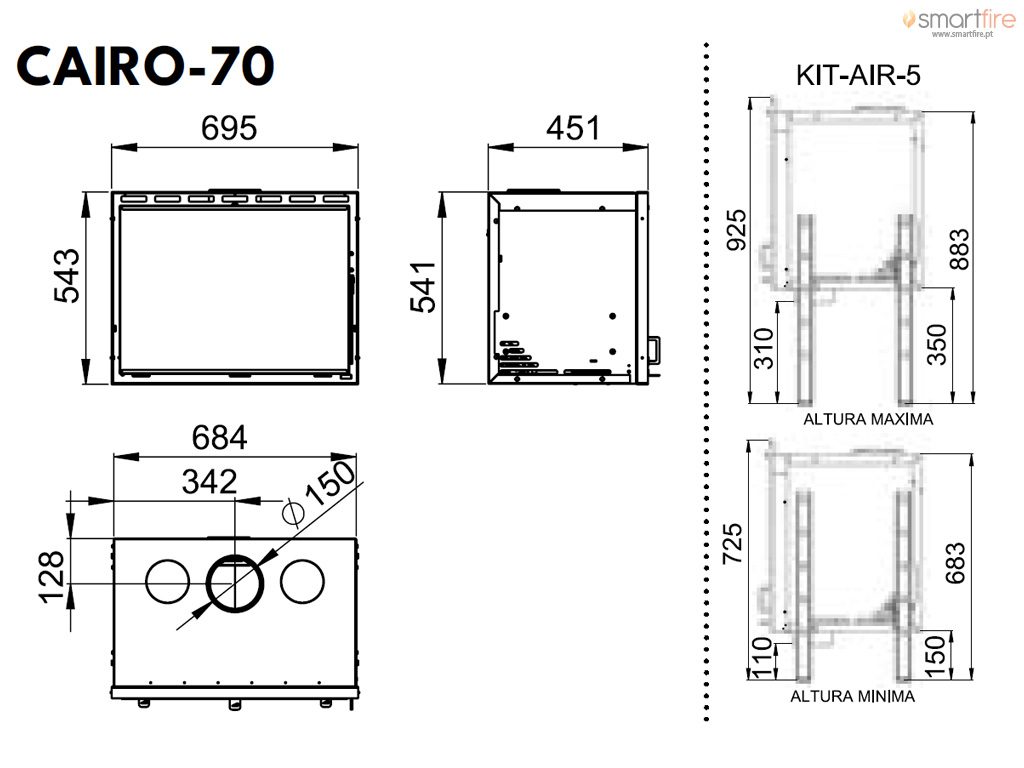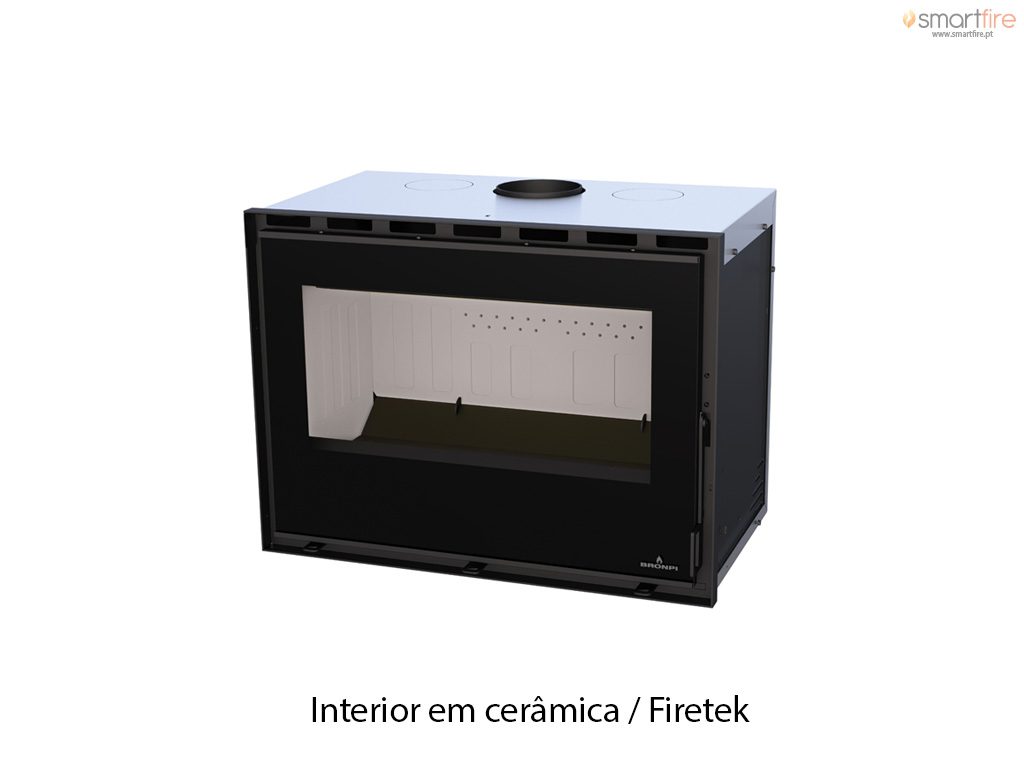 Recuperador de Calor Bronpi Cairo 70 é construído em aço, pintado com tinta anticalórica resistente a 650ºC. Tem a possibilidade de escolher entre interior da câmara de combustão em vermiculite ou cerâmico. Possui uma grelha em fundição removível e gaveta de cinzas extraível para fácil limpeza. O Bronpi Cairo 70 com saídas de ar canalizável pré-perfuradas possibilita a regulação do ar de combustão primário e secundário. Com dupla e tripla combustão.