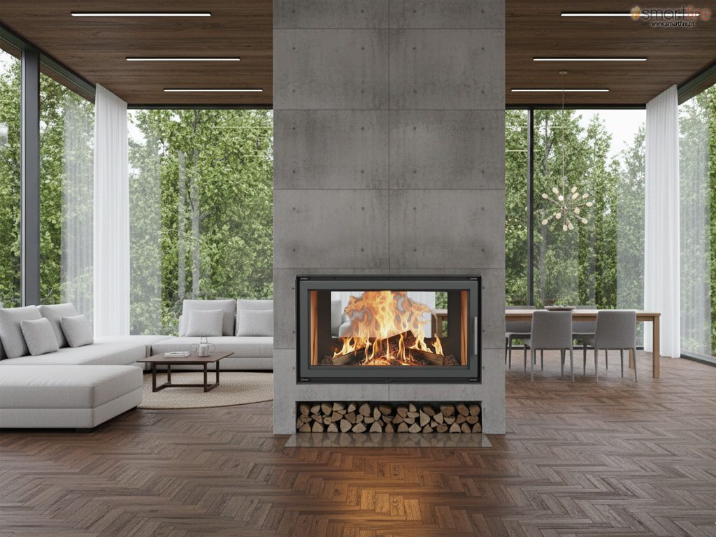 Imagine uma noite tranquila: de um lado, uma sala aconchegante; do outro, uma zona de refeições ou escritório — sempre conectados pela mesma chama quente e dançante. A luz suave, o som da lenha a arder e o calor que se expande nas duas direções criam uma atmosfera verdadeiramente especial.