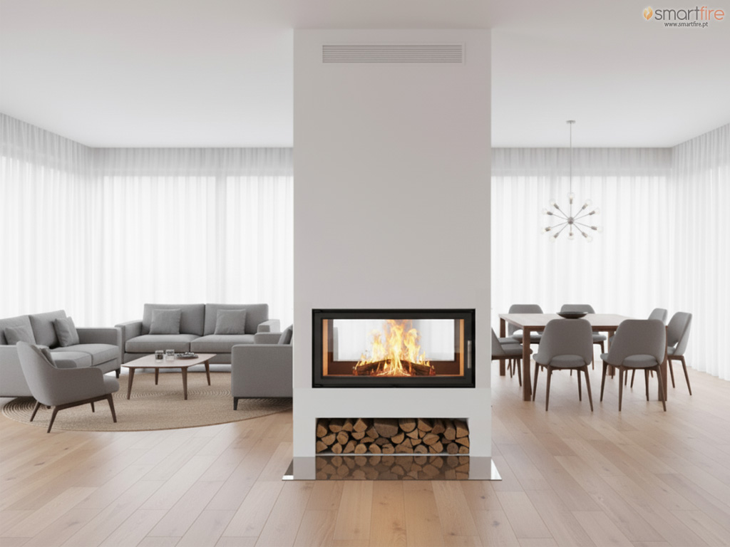 Imagine uma noite tranquila: de um lado, uma sala aconchegante; do outro, uma zona de refeições ou escritório — sempre conectados pela mesma chama quente e dançante. A luz suave, o som da lenha a arder e o calor que se expande nas duas direções criam uma atmosfera verdadeiramente especial.