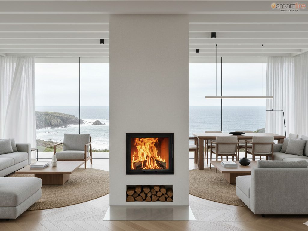 Design Moderno: Vidro decorativo exterior e visão panorâmica da chama, tornando o equipamento uma peça central de decoração.