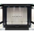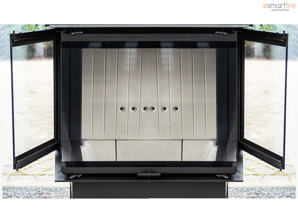 - Sistema Duplo de Abertura de Porta: A porta pode ser aberta para cima (sistema Lift-up) e para os lados (esquerda e direita), facilitando a colocação de lenha e a limpeza do vidro.