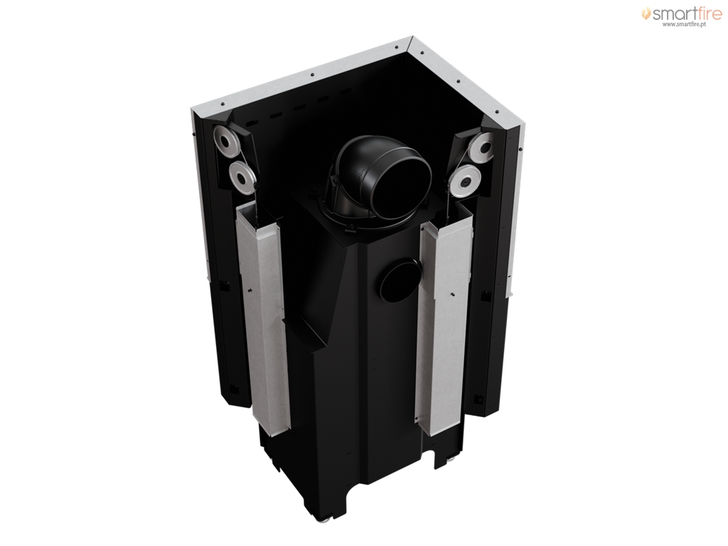 • O ar primário é fornecido de fora, graças à conexão de entrada de ar embutida de 125 mm. O tubo de entrada de ar está localizado no fundo do cartucho. A sua regulação é feita por acelerador embutido, regulado por um controlador abaixo da porta, o que exclui erros por uso indevido. Todo o mecanismo funciona dentro da lareira, muito silencioso e sem problemas.