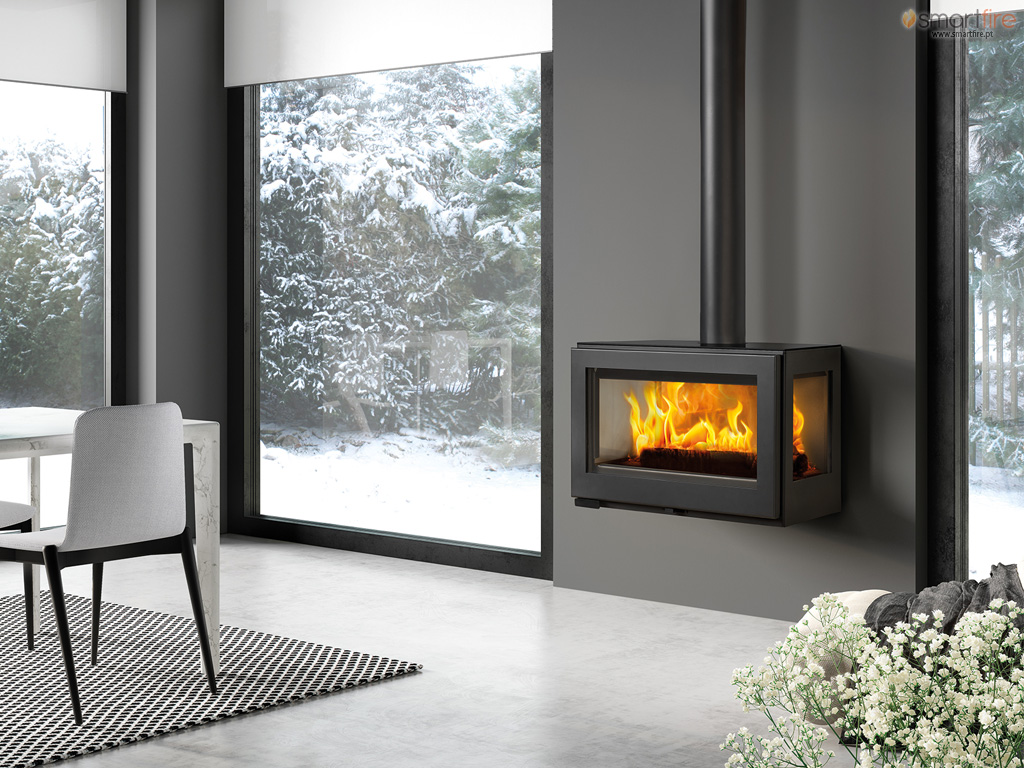 Salamandra a lenha num estilo moderno, com 3 vidros e conforme as normas de Ecodesign.