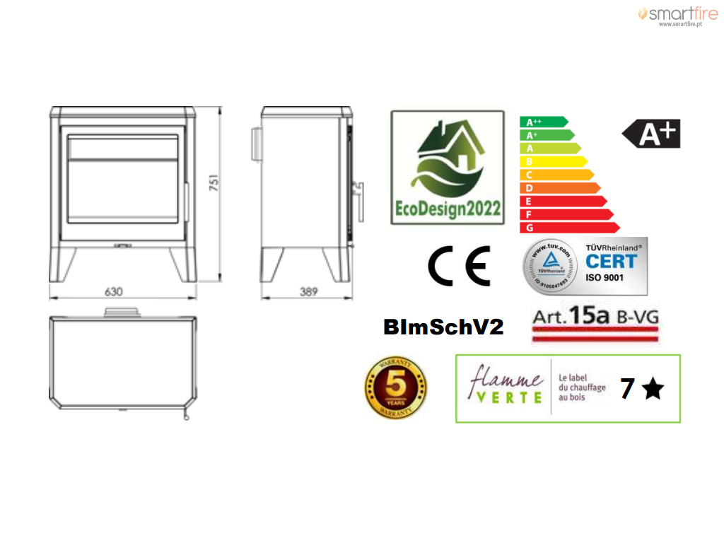 Salamandra a lenha num estilo clássico e conforme as normas de Ecodesign. O seu design é ideal para todos os tipos de salas (751x630x389 mm). Tem um volume de aquecimento de 220 m3 e uma potência termica de 7,1 KW. Capacidade de registo até 50 cm. Grelha e porta de ferro fundido. Sistema de vidro limpo, que acrescenta funcionalidade. Tripla combustão e duplo corpo em aço.
