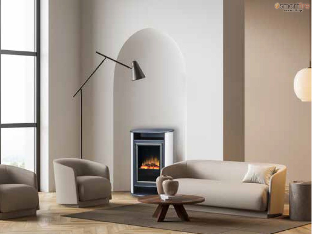 Uma geometria oval bem equilibrada caracteriza a lareira eléctrica Scandic, com um design inspirado num estilo sueco. Um compartimento para troncos está no interior para realçar a sua aparência, bem como uma prateleira de armazenamento na parte superior, para personalizá-lo de acordo com seu estilo.