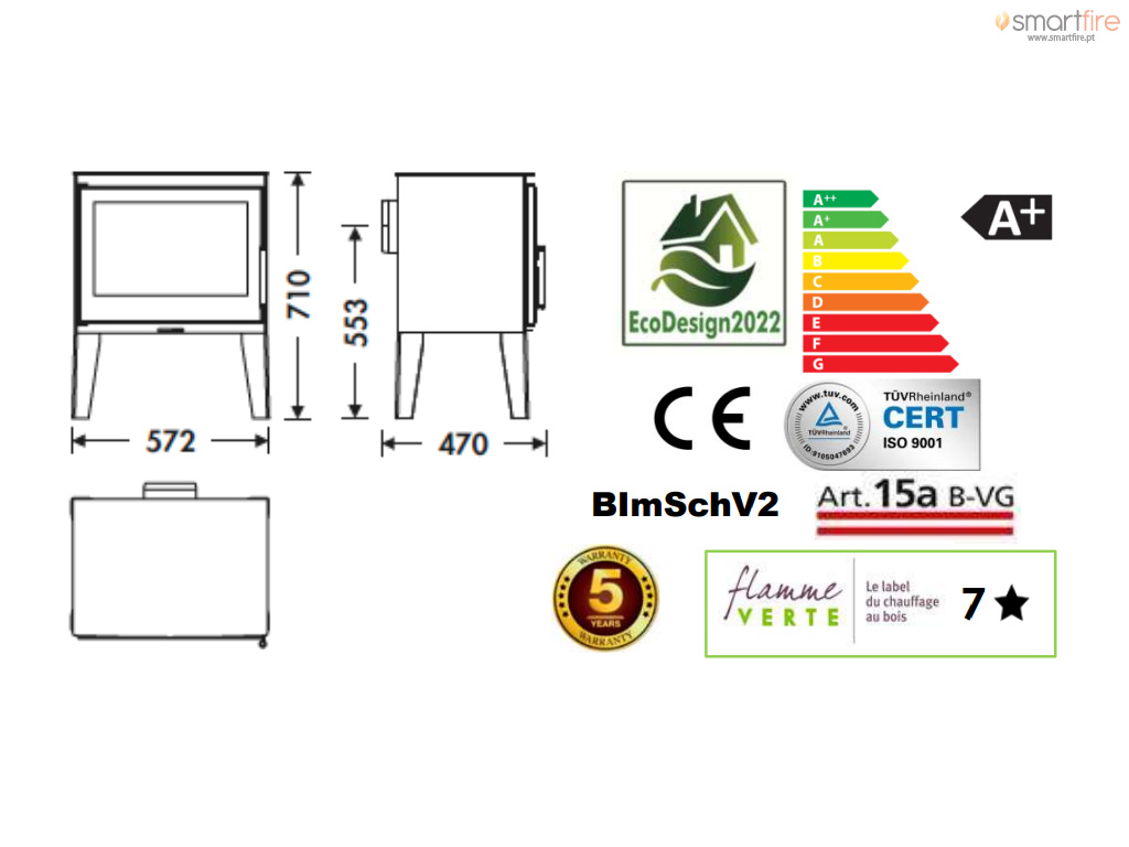 Salamandra a lenha num estilo clássico e conforme as normas de Ecodesign. O seu design é ideal para todos os tipos de salas (710x572x470 mm). Tem um volume de aquecimento de 220 m3 e uma potência térmica de 7,1 KW. Capacidade de registo até 50 cm. Grelha de ferro fundido. Sistema de vidro limpo, que acrescenta funcionalidade. Tripla combustão e duplo corpo em aço.