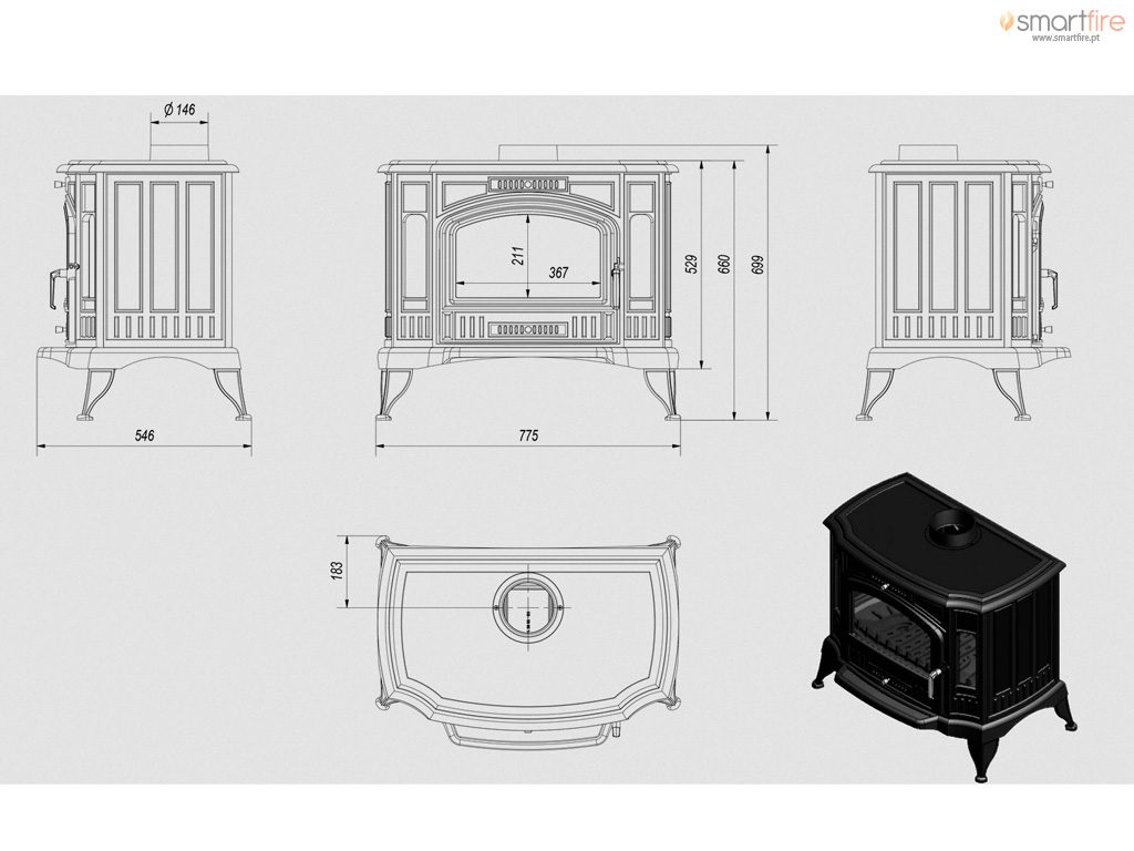 - Gaveta/contentor de cinzas, na qual se acumulam os restos de madeira queimada e uma grelha móvel para facilitar a remoção das cinzas.