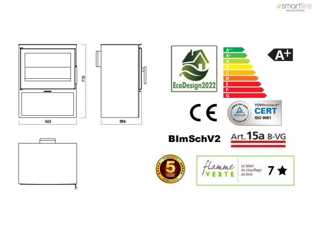 Salamandra a lenha num estilo clássico e conforme as normas de Ecodesign. O seu design é ideal para todos os tipos de salas (710x563x396 mm). Tem um volume de aquecimento de 220 m3 e uma potência térmica de 7,1 KW. Capacidade de registo até 50 cm. Grelha de ferro fundido. Sistema de vidro limpo, que acrescenta funcionalidade. Tripla combustão e duplo corpo em aço.